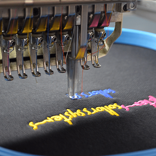 How does it work? The artwork or logo has to be “digitized” which is the specialized process of converting 2D artwork into stitches or threads. The thread colors are loaded into machines, and the machine is programmed to sew the design.